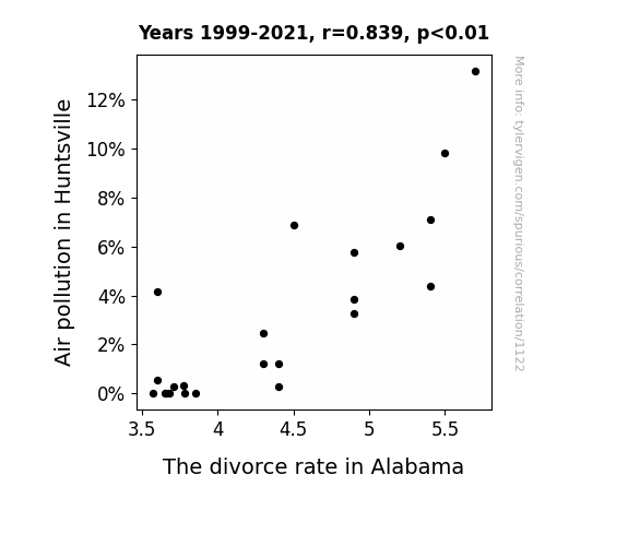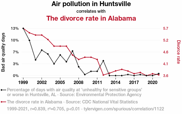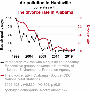 This means 70.5% of the change in the one variable (i.e., The divorce rate in Alabama) is predictable based on the change in the other (i.e., Air pollution in Huntsville) over the 23 years from 1999 through 2021.