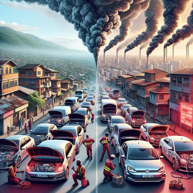 Prompt: [ Symbolism ] In this image, a bustling city in Burundi comes to life with an array of cars and buses maneuvering through narrow streets as smoke billows from their exhausts. The atmosphere is thick with a sense of urgency and movement. Meanwhile, in the United States, a line of shiny Volkswagen cars stands prominently, their hoods open as skilled mechanics meticulously work on their electronic systems, surrounded by an aura of technological prowess and precision. An invisible ripple effect originating from the carbon emissions in the Burundi city travels across the globe and abruptly disrupts the once flawless Volkswagen cars, causing them to glitch and demand immediate attention. The depiction should include only scenes, people, and objects, it should not include text or speech bubbles.