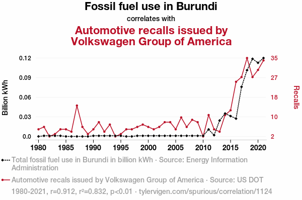 - The spurious research paper: Fuel for Thought: The Correlation Between Fossil Fuel Use in Burundi and Automotive Recalls by Volkswagen Group of America