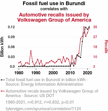 This means 83.2% of the change in the one variable (i.e., Automotive recalls issued by Volkswagen Group of America) is predictable based on the change in the other (i.e., Fossil fuel use in Burundi) over the 42 years from 1980 through 2021.