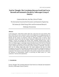 "Fossil fuel use, automotive recalls, Burundi, Volkswagen Group of America, correlation coefficient, p-value, Energy Information Administration, US DOT, vehicle safety, fuel quality, environmental conditions, interdisciplinary inquiry"