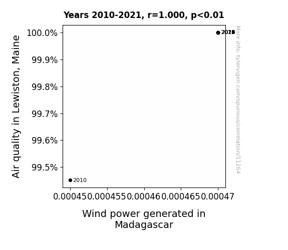 This means 100% of the change in the one variable (i.e., Wind power generated in Madagascar) is predictable based on the change in the other (i.e., Air quality in Lewiston, Maine) over the 12 years from 2010 through 2021.