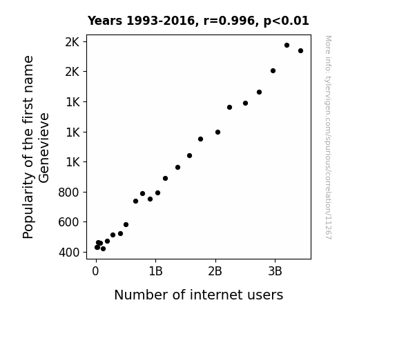 This means 99.3% of the change in the one variable (i.e., Number of internet users) is predictable based on the change in the other (i.e., Popularity of the first name Genevieve) over the 24 years from 1993 through 2016.