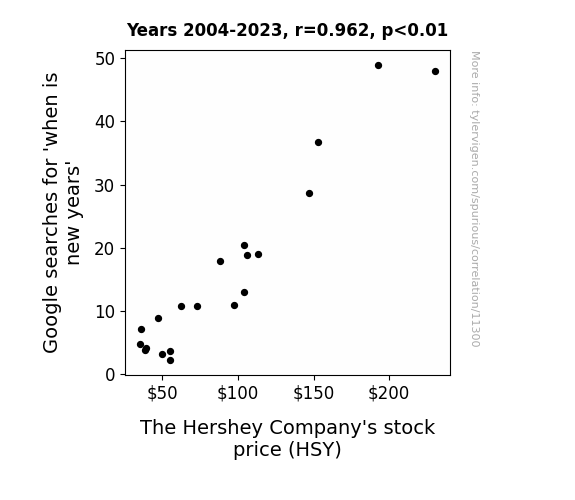 This means 92.6% of the change in the one variable (i.e., The Hershey Company's stock price (HSY)) is predictable based on the change in the other (i.e., Google searches for 'when is new years') over the 20 years from 2004 through 2023.