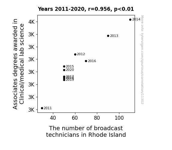 This means 91.4% of the change in the one variable (i.e., The number of broadcast technicians in Rhode Island) is predictable based on the change in the other (i.e., Associates degrees awarded in Clinical/medical lab science) over the 10 years from 2011 through 2020.