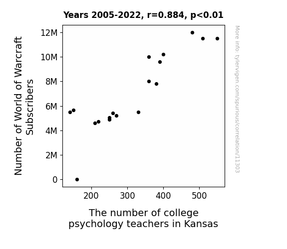 This means 78.2% of the change in the one variable (i.e., The number of college psychology teachers in Kansas) is predictable based on the change in the other (i.e., Number of World of Warcraft Subscribers) over the 18 years from 2005 through 2022.