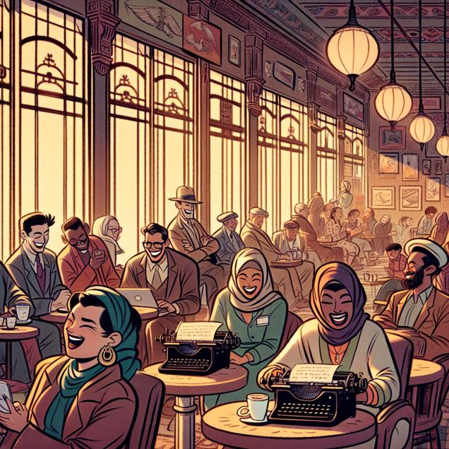 Prompt: An image that looks like it is a scene from a Pixar movie, imagine a quaint coffee shop in Missouri with a warm, inviting atmosphere. Through the floor-to-ceiling windows, a soft light gently illuminates the eclectic interior. The patrons inside are engaged in various activities. In one corner, a group of friends, portrayed with distinct and varied facial expressions, are chuckling at an xkcd comic on their smartphones. Their laughter reverberates through the space, creating a heartwarming sense of camaraderie. On the opposite side, another group of patrons are seated at a vintage, worn-out mahogany table, meticulously typing away on vintage typewriters. Each typist exudes a sense of purpose and dedication, their fingers dancing gracefully over the keys. The room is filled with the soothing sounds of clacking and gentle laughter. As the laughter from the xkcd comic fills the air, the typists seem to momentarily pause, their faces illuminated by the soft glow of the coffee shop. They share knowing glances with each other, and one by one, they close their typewriters and join the group of friends, enchanted by their joyous laughter. The unexpected convergence of these two groups showcases the surprising correlation between the decrease in internet-related humor content and the dwindling number of typists in Missouri, capturing an ephemeral moment where the two variables seem to influence each other in an unexpected way. The depiction should include only scenes, people, and objects, it should not include text or speech bubbles.