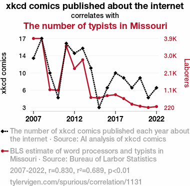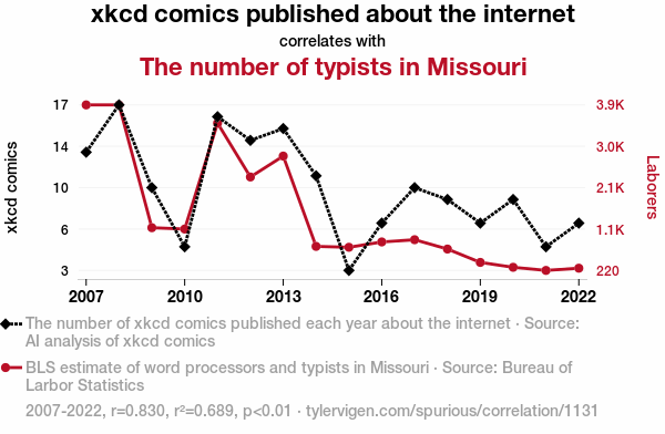 This means 68.9% of the change in the one variable (i.e., The number of typists in Missouri) is predictable based on the change in the other (i.e., xkcd comics published about the internet) over the 16 years from 2007 through 2022.