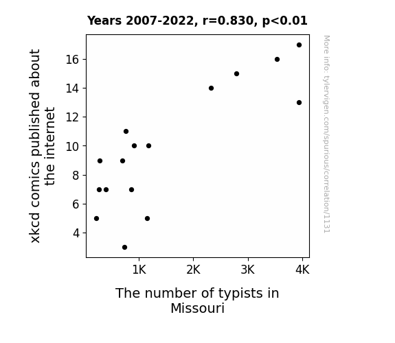 xkcd comics, internet comics, Missouri typists, statistical analysis, correlation coefficient, p-value, AI analysis, Bureau of Labor Statistics, typist population, internet musings, Show-Me State, unexpected connections, lighthearted statistical research