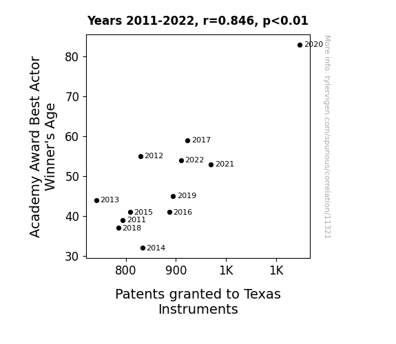 This means 71.6% of the change in the one variable (i.e., Patents granted to Texas Instruments) is predictable based on the change in the other (i.e., Academy Award Best Actor Winner's Age) over the 12 years from 2011 through 2022.