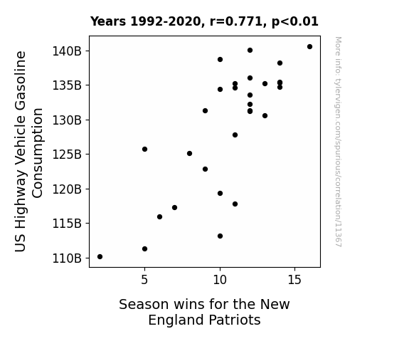 This means 59.4% of the change in the one variable (i.e., Season wins for the New England Patriots) is predictable based on the change in the other (i.e., US Highway Vehicle Gasoline Consumption) over the 29 years from 1992 through 2020.