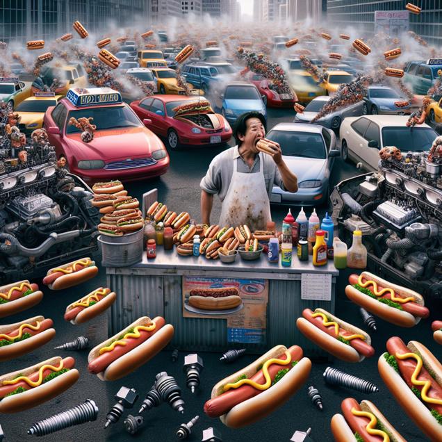 Prompt: [ A photo-realistic image ] Imagine a scene at a bustling hotdog stand, where a champion hotdog eater is devouring an impressive number of hotdogs. In the background, a line of cars are being towed away for repairs, with smoke billowing from their malfunctioning engines. The hotdog eater is surrounded by an unusual amount of car parts, spark plugs, and engine components, which seem to be magically floating in the air and landing precariously on the cars, causing them to sputter and smoke. The scene illustrates the surprising connection between hotdog consumption and automotive recalls, leaving viewers scratching their heads in disbelief. The depiction should include only scenes, people, and objects, it should not include text or speech bubbles.