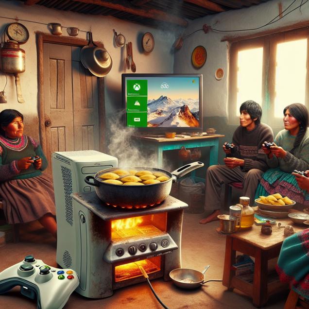 User prompt: Please describe a visual scene that depicts the following situation. Keep the description simple. The Decline of Xbox 360 Sales Leads to Decrease in Kerosene Use in Bolivia Due to Reduced Gaming-Fueled Late Night Empanada Frying Sessions