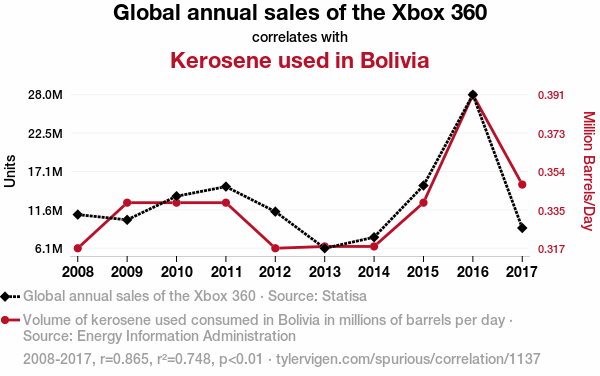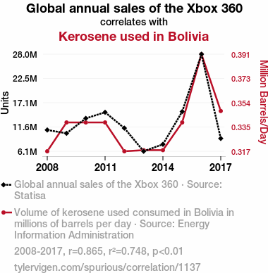 - The spurious research paper: Tango Between Xbox 360 Sales and Bolivian Kerosene Usage: An Unlikely Pair?
