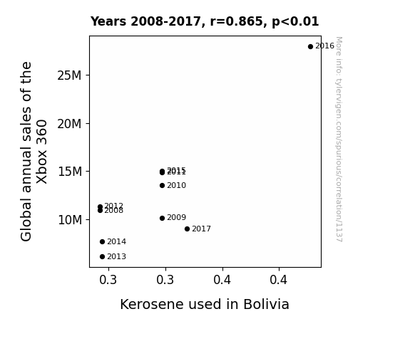 The statistical analysis unveiled a remarkably strong correlation between global annual sales of the Xbox 360 and the consumption of kerosene in Bolivia from 2008 to 2017. The correlation coefficient of 0.8651099 suggests a robust positive relationship between these seemingly incongruous variables, akin to discovering a shared taste in music between a rock star and a symphony conductor. This finding invites speculation about the intricate ways in which economic forces intermingle, akin to the unexpected camaraderie between a bull and a matador.
