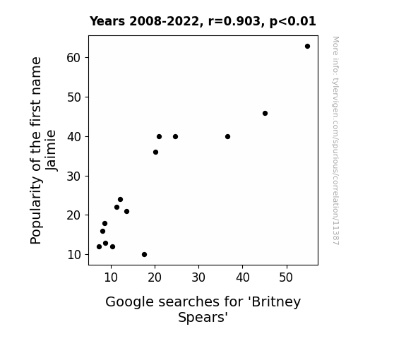 This means 81.6% of the change in the one variable (i.e., Google searches for 'Britney Spears') is predictable based on the change in the other (i.e., Popularity of the first name Jaimie) over the 15 years from 2008 through 2022.