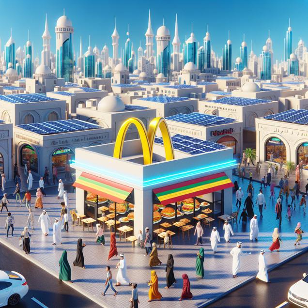 Prompt: Generate an image of a 3D Pixar-style cityscape set in bright and sunny Bahrain. The rooftops are adorned with solar panels basking in the abundant sunshine, and the streets are buzzing with vibrant energy. In the foreground, showcase a local McDonald's where happy customers are seen enjoying their meals under the cheery skies. The increased solar power has created a joyful atmosphere, leading to an increase in customer satisfaction and making people feel more positive and upbeat. The depiction should include only scenes, people, and objects, it should not include text or speech bubbles.