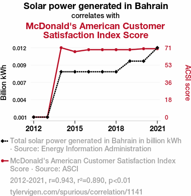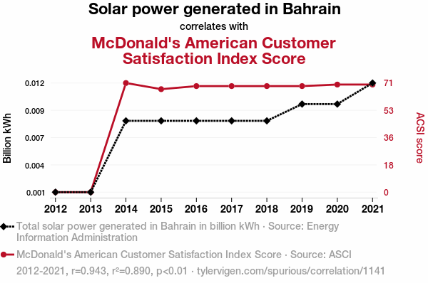 This means 89% of the change in the one variable (i.e., McDonald's American Customer Satisfaction Index Score) is predictable based on the change in the other (i.e., Solar power generated in Bahrain) over the 10 years from 2012 through 2021.