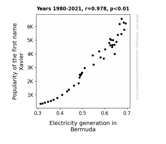 This means 95.6% of the change in the one variable (i.e., Electricity generation in Bermuda) is predictable based on the change in the other (i.e., Popularity of the first name Xavier) over the 42 years from 1980 through 2021.