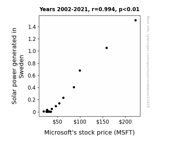 This means 98.7% of the change in the one variable (i.e., Microsoft's stock price (MSFT)) is predictable based on the change in the other (i.e., Solar power generated in Sweden) over the 20 years from 2002 through 2021.