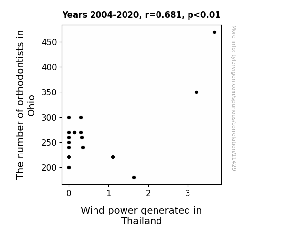 This means 46.3% of the change in the one variable (i.e., Wind power generated in Thailand) is predictable based on the change in the other (i.e., The number of orthodontists in Ohio) over the 17 years from 2004 through 2020.