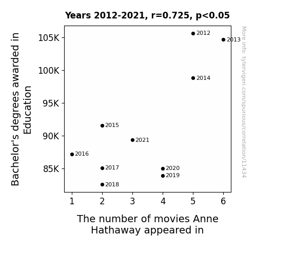 This means 52.6% of the change in the one variable (i.e., The number of movies Anne Hathaway appeared in) is predictable based on the change in the other (i.e., Bachelor's degrees awarded in Education) over the 10 years from 2012 through 2021.
