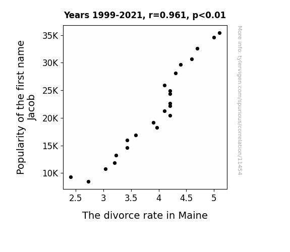 This means 92.4% of the change in the one variable (i.e., The divorce rate in Maine) is predictable based on the change in the other (i.e., Popularity of the first name Jacob) over the 23 years from 1999 through 2021.