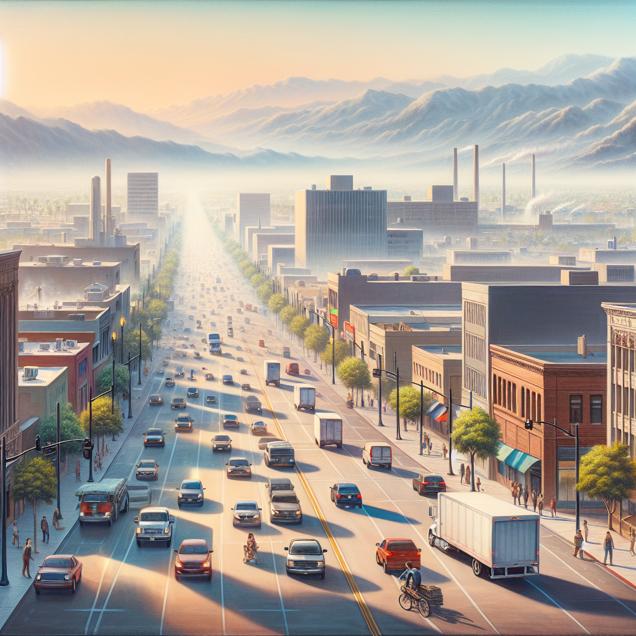 ChatGPT: [Concept art] Generate an image of a busy street in Bakersfield, California, where the air quality has improved. The once hazy and smog-filled air has cleared, allowing the cars to move more freely. The vehicles appear to be breathing more easily, with smoother acceleration and a greater sense of openness in the air. Depict the reduced need for speed control repairs as the vehicles now operate more smoothly in the fresh, clear air. Capture the busy nature of the street with a focus on the sense of lightness and ease.