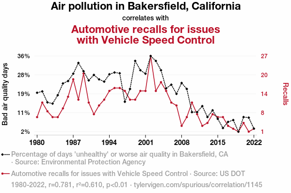 A linear line chart with years as the X-axis and two variables on the Y-axis. The first variable is Air pollution in Bakersfield, California and the second variable is Automotive recalls for issues with Vehicle Speed Control.  The chart goes from 1980 to 2022, and the two variables track closely in value over that time. Small Image