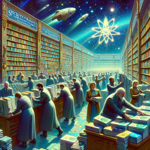 Prompt: An image that looks like it is a scene from 'Star Wars' depicting a bustling bookstore where a large stack of homeland security textbooks is being restocked on the shelves, with students eagerly picking them up. In the background, a liquor store is visible, showcasing a long line of customers at the checkout counter, each person purchasing a bottle of spirit with an image of a guardian angel on the label. As the demand for spiritual protection becomes apparent, the shelves are being hurriedly restocked. The depiction should include only scenes, people, and objects, it should not include text or speech bubbles.