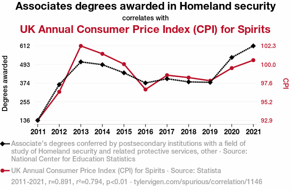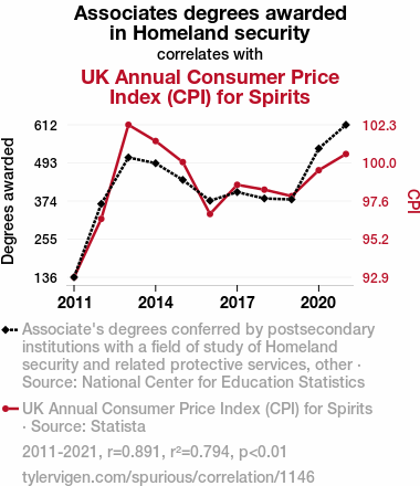 - The spurious research paper: A Spirited Connection: Exploring the Link Between Associates Degrees in Homeland Security and Consumer Price Index for Spirits in the UK