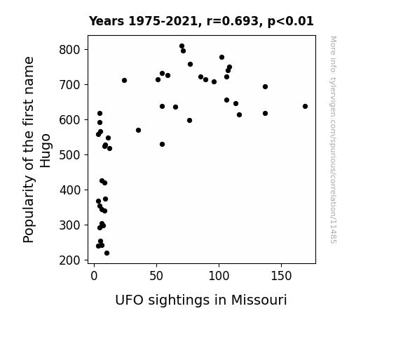 This means 48% of the change in the one variable (i.e., UFO sightings in Missouri) is predictable based on the change in the other (i.e., Popularity of the first name Hugo) over the 47 years from 1975 through 2021.