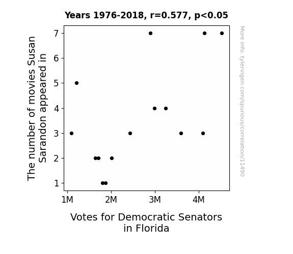 This means 33.3% of the change in the one variable (i.e., Votes for Democratic Senators in Florida) is predictable based on the change in the other (i.e., The number of movies Susan Sarandon appeared in) over the 15 years from 1976 through 2018.