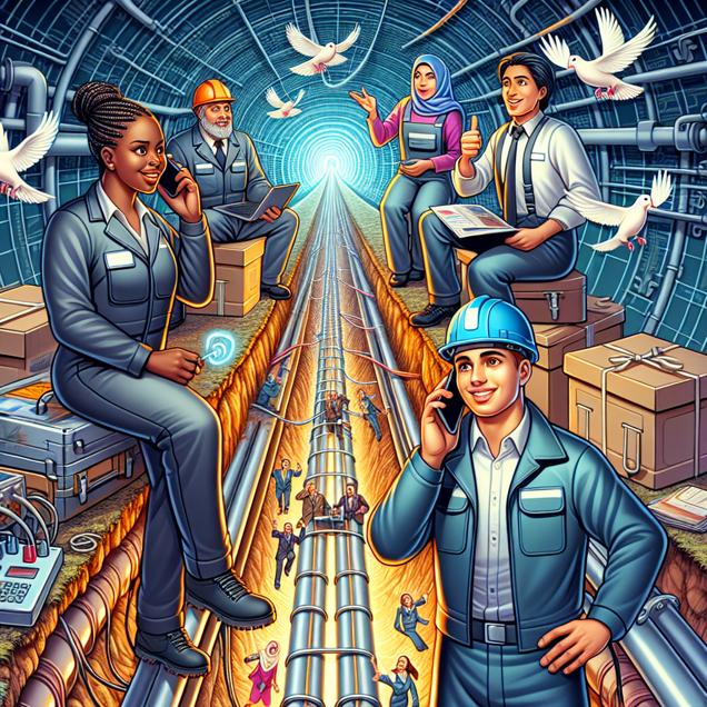 Prompt: Create an image where the landscape is divided into three layers. The foreground depicts a group of technicians in heavy work attire maneuvering specialized equipment to carefully repair the network of underground tunnels. The middle ground portrays the tunnels, made visible by a slight glow revealing the carrier pigeons within. In the background, customers are seen happily conversing on their phones, with radiant smiles on their faces, while the signal strength of Verizon visibly improves. Each layer should exhibit depth and a sense of movement. The depiction should include only scenes, people, and objects, it should not include text or speech bubbles.