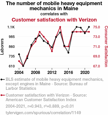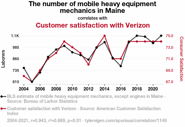 This means 88.9% of the change in the one variable (i.e., Customer satisfaction with Verizon) is predictable based on the change in the other (i.e., The number of mobile heavy equipment mechanics in Maine) over the 18 years from 2004 through 2021.