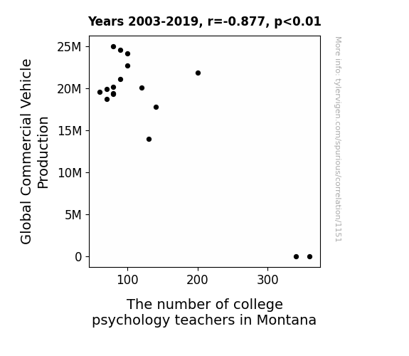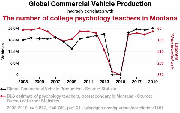 This means 76.9% of the change in the one variable (i.e., The number of college psychology teachers in Montana) is predictable based on the change in the other (i.e., Global Commercial Vehicle Production) over the 17 years from 2003 through 2019.