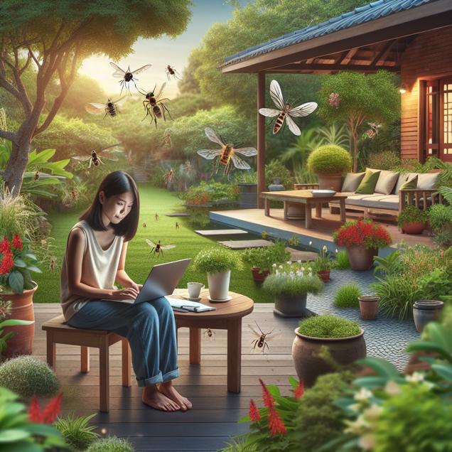 ChatGPT: Generate an image of a serene backyard scene with a person sitting in front of a computer. The atmosphere should exude a sense of tranquility as fewer mosquitoes buzz around the area, leading to a reduction in the number of spiders crawling about. The person is seated comfortably, with a lower number of search results displayed on the screen for "how to trap a spider." The focus should be on the peaceful coexistence of nature and technology in the tranquil outdoor setting.