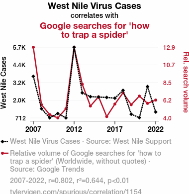 West Nile Virus, trap a spider, Google searches, correlation, West Nile Support organization, Google Trends, mosquito-borne illnesses, spider-catching tactics, pest-related dangers, internet queries, interconnectedness