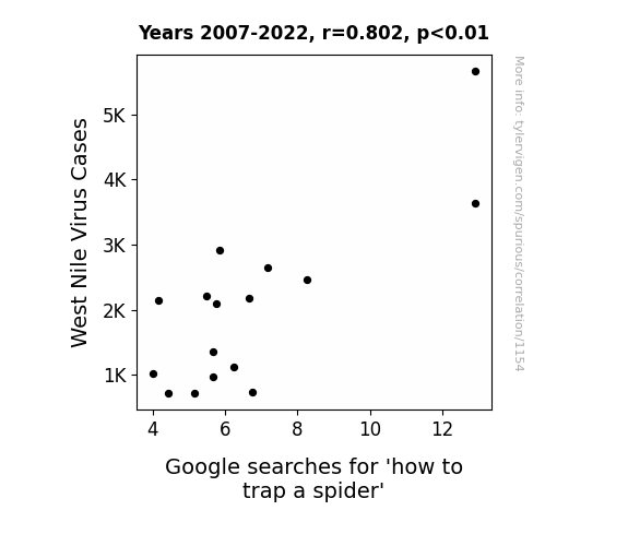 User prompt: Please provide potential search keywords for a paper titled Caught in the Web: Unraveling the Connection Between West Nile Virus and How to Trap a Spider Google Searches with an abstract of As the saying goes, "spiders and viruses, oh my!" In this study, we set out to investigate the peculiar relationship between West Nile Virus (WNV) cases and Google searches for "how to trap a spider." Despite sounding like a tangled web of unrelated topics, we utilized data from the West Nile Support organization and Google Trends to untangle this web of curiosity. Our findings revealed a surprising correlation coefficient of 0.8024517 and statistically significant p-value of less than 0.01 from 2007 to 2022. This quirky correlation sheds light on the curious behaviors of the human mind when confronted with the threat of mosquito-borne illnesses. Our results suggest that while individuals may initially seek out methods to capture eight-legged pests, their elevated concerns may extend to other pest-related dangers, including the dreaded West Nile Virus. As we delve into the interconnectedness of seemingly unrelated search queries, it's clear that in the world of internet queries, the line between spider-catching tactics and mosquito-borne illness prevention may just be a strand of silk.
