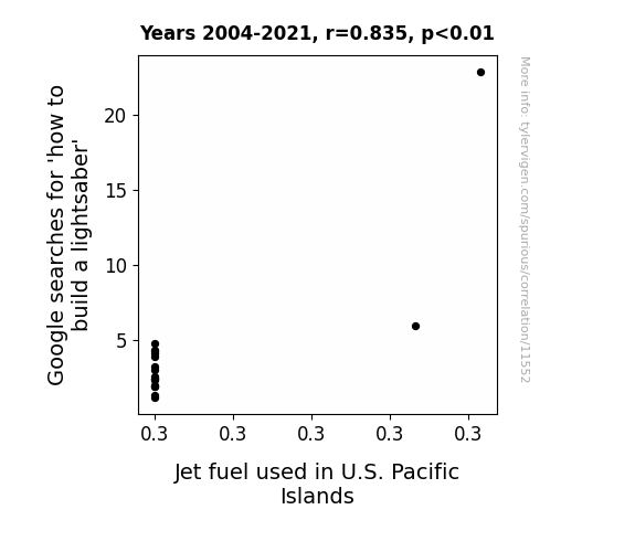 This means 69.7% of the change in the one variable (i.e., Jet fuel used in U.S. Pacific Islands) is predictable based on the change in the other (i.e., Google searches for 'how to build a lightsaber') over the 18 years from 2004 through 2021.