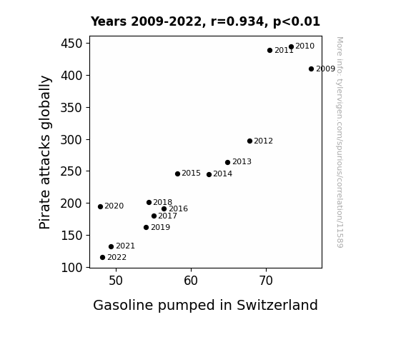 This means 87.3% of the change in the one variable (i.e., Gasoline pumped in Switzerland) is predictable based on the change in the other (i.e., Pirate attacks globally) over the 14 years from 2009 through 2022.