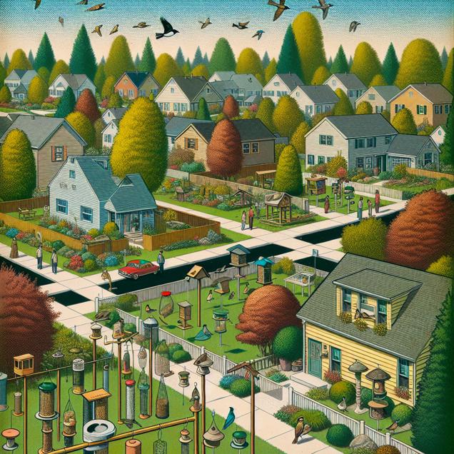ChatGPT: Generate an image of a suburban neighborhood in Connecticut, illustrated in a retro comic-book style. The houses are surrounded by vibrant, bird-friendly landscaping, with trees and bushes that attract various bird species. Each house is adorned with bird feeders, birdhouses, and bird baths, designed in a 1960s muted color palette with a dotted halftone pattern. Homeowners can be seen animatedly discussing and admiring the various bird-friendly features of their properties. The scene embodies a competitive and aesthetically pleasing bird haven within the community, with the real estate market booming.