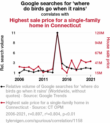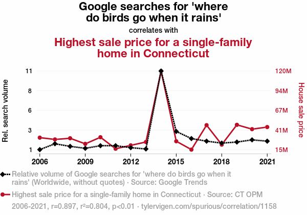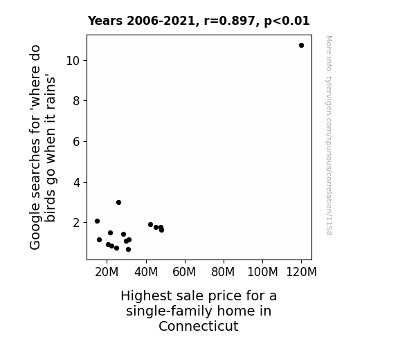 - The spurious research paper: A Nest-Egg or Just a Fluke? Exploring the Correlation Between Google Searches for 'Where Do Birds Go When it Rains' and Highest Sale Price for a Single-Family Home in Connecticut