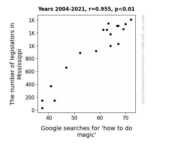 This means 91.3% of the change in the one variable (i.e., Google searches for 'how to do magic') is predictable based on the change in the other (i.e., The number of legislators in Mississippi) over the 18 years from 2004 through 2021.