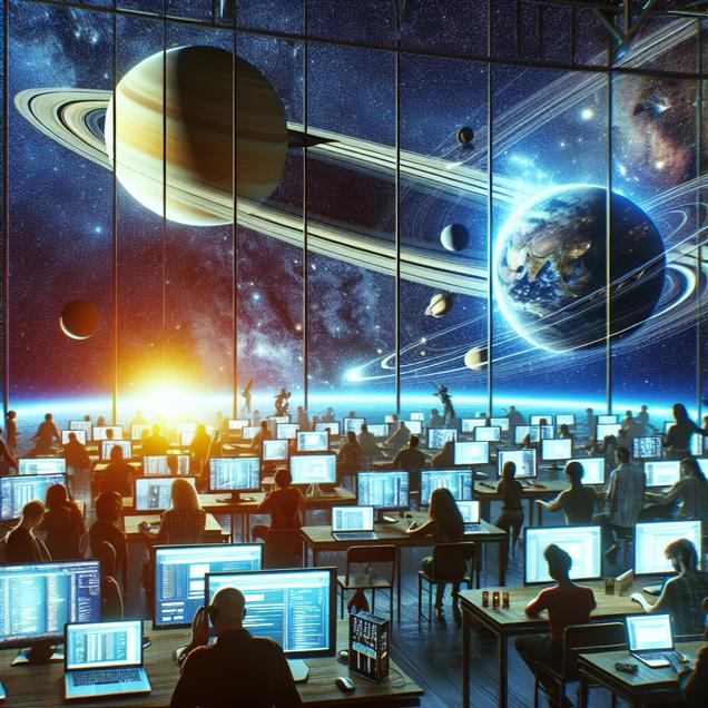 Prompt: Prompt: Generate an image that portrays a room filled with music fans sitting at their computers, excitedly downloading digital music singles. In the background, Saturn and Jupiter are seen getting closer in the night sky, exerting noticeable gravitational forces causing internet signals to slow down. A few frustrated fans are shown shaking their heads, while others are seen walking over to a nearby shelf to pick up physical CDs instead. The atmosphere should depict a blend of digital and physical music consumption amidst the cosmic spectacle. The visual should exude a futuristic, cyber art aesthetic. The depiction should include only scenes, people, and objects, it should not include text or speech bubbles.