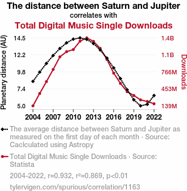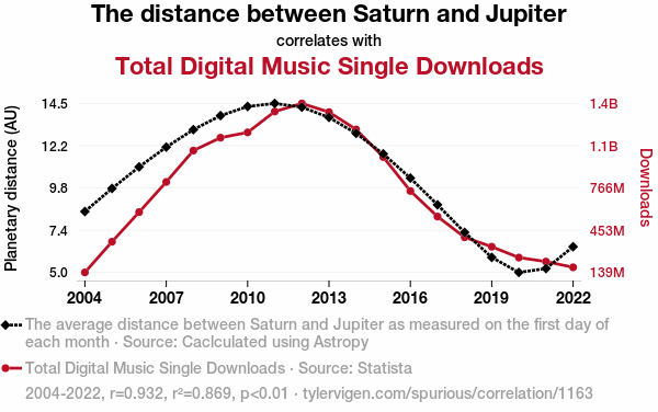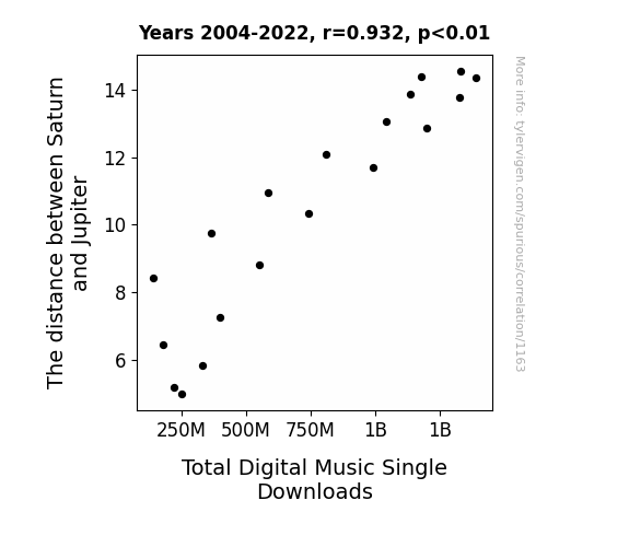 This means 86.9% of the change in the one variable (i.e., Total Digital Music Single Downloads) is predictable based on the change in the other (i.e., The distance between Saturn and Jupiter) over the 19 years from 2004 through 2022.