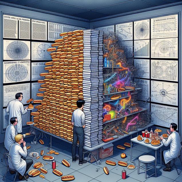 User prompt: Please describe a visual scene that depicts the following situation. Keep the description simple. New Study Finds Surprising Correlation Between xkcd Comics About Time and Hot Dogs Consumed by Nathan's Hot Dog Eating Competition Champion - Researchers stunned by discovery that for every xkcd comic published about time, the number of hot dogs consumed by the reigning champion of the Nathan's Hot Dog Eating Competition increases exponentially. One leading theory posits that the intricate graphs and complex mathematical jokes in the popular webcomic somehow trigger an insatiable hunger for processed meat products in competitive eaters, leading to record-breaking consumption levels. While the scientific community is still baffled by this unexpected connection, it seems that the fate of competitive hot dog eating may be more entwined with webcomics than anyone could have ever imagined.