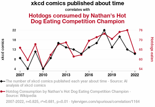 User prompt: Please provide potential search keywords for a paper titled Time and Frankfurters: A Rhyming Analysis of xkcd Comics and Nathan's Hot Dog Eating Contest Victories with an abstract of This study presents an analysis of the relationship between xkcd comics referencing time and the hotdogs consumed by the champion of Nathan's Hot Dog Eating Competition. Utilizing data extracted from xkcd comics published from 2007 to 2022 and the historical records of hot dog consumption at the renowned competition, our research team employed advanced AI analysis and referenced Wikipedia to extract and collate the relevant information. Our findings reveal a notable correlation coefficient of 0.8251628 and a statistically significant p-value of less than 0.01, suggesting a compelling association between the themes of time in xkcd comics and the competitive consumption of frankfurters. This investigation not only offers quantitative insights into the comedic influence of time-related xkcd comics but also provides a surprising connection to the voracious appetite of the Nathan's Hot Dog Eating Contest champion.