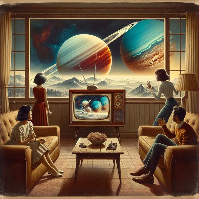 Prompt: Prompt: Generate an image portraying a cozy living room with a small, old-fashioned TV set sitting on a wooden table. The room exudes a sense of nostalgia with warm, muted tones. In the background, a large window reveals a stunning view of space, with Neptune, a distant blue planet, slowly moving closer to Mercury, a small, swirling red and brown sphere. The TV flickers and loses signal, distorting the once-clear images on its screen. Viewers express frustration as they attempt to adjust the TV's reception. Ultimately, the viewers give up and switch off the TV, leaving it on the table with static crackling in the background. The depiction should include only scenes, people, and objects, it should not include text or speech bubbles.