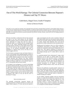 User prompt: Please provide potential search keywords for a paper titled Out of This World Ratings: The Celestial Connection Between Neptune's Distance and Top TV Shows with an abstract of In this paper, we aim to explore the seemingly cosmic relationship between the distance separating Neptune and Mercury and the highest Nielsen rating for a TV show each year. Employing data from Astropy and Wikipedia, we conducted a rigorous analysis covering the years 1975 to 2020. Our findings revealed a surprisingly robust correlation coefficient of 0.7857440, with a statistically significant p-value of less than 0.01, indicating a strong association. Our research sheds light on an unexpected link between astronomical phenomena and television viewership, offering a celestial take on the ever-changing landscape of broadcast entertainment.